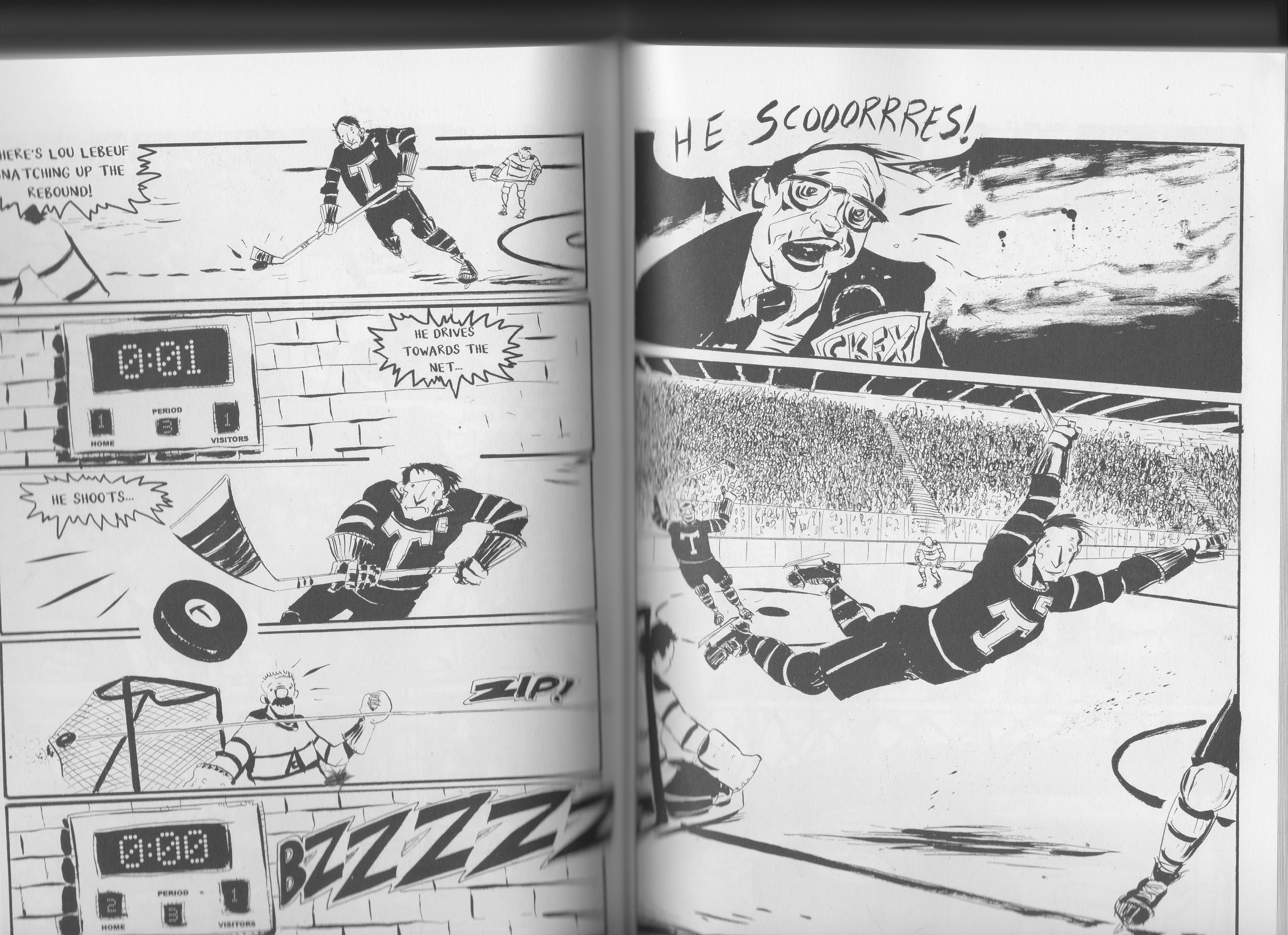 Lou embodies Vince by capturing his desires in two ways, most obviously in his sexual tryst with Beth (201.5), but also in brief moments of superior play on the ice. In the specific games Lou reflects upon, he never passes to his brother. It is relevant that Lou recognizes his brother as the better player, yet there is no instance where he helps Vince on the ice: Lou does not respect his line enough to pass the puck to its best scorer. Lou instead capitalizes on one of Vince’s failed goals, a shot off the post (187.8). Lou’s quest for personal glory is conveyed most clearly in his post-goal celebration: a dive through the air mimicking Bobby Orr’s celebration following “the goal,” an iconic championship-winning overtime goal in game 4 of the 1970’s Stanley Cup Final. Lou inserts himself into a particular moment in hockey history as one of the sport’s most celebrated athletes to associate himself with that glory. Yet he does so at the expense of one of Vince’s rare failures.