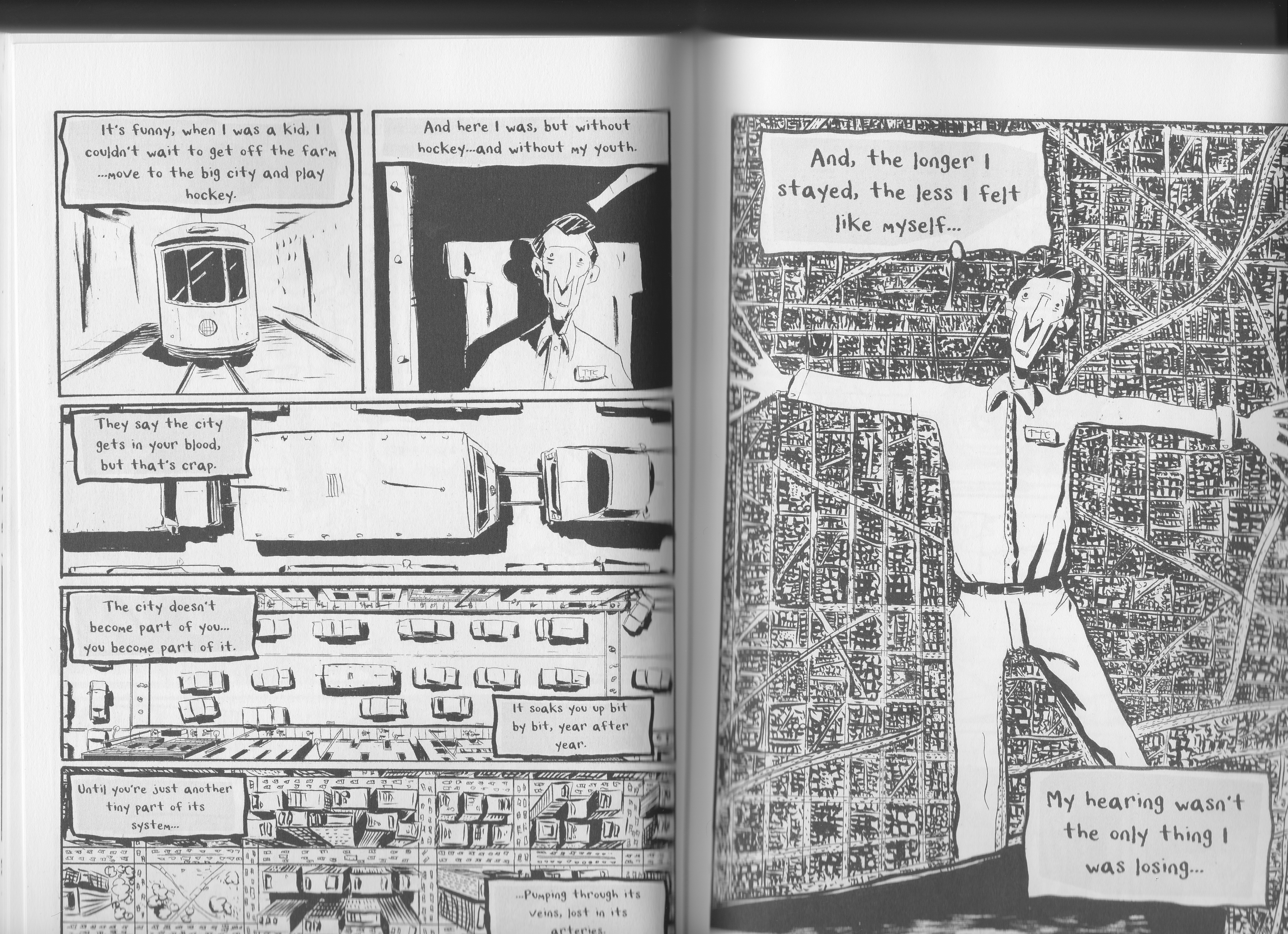 Lou is a selfish person, as illustrated in his play in hockey, and he wants to be his brother, as illustrated in the ways he substitutes himself in his brother’s life. Furthermore, Lou’s departure from Vince is emphasized in the illustrations that physically alienate him from Vince’s family-oriented path in life. The signification “Ghost Stories” ultimately reaches is that Lou struggles with his own emasculation and a desire to live the (possibly imagined) masculine life of his brother. However, where Vince’s path of life draws him closer to others, Lou’s only isolates him. Lou remains an outsider interpreting his fantasized life of Vince, ignoring Vince’s gestures of kindness such as his willingness to pass the puck in play or to reach back through past events and offer peace on the farm. “Ghost Stories” demonstrates the toxicity of possessive masculinity and the self-directed isolation one faces in glorifying such a narrow understanding of manhood. By illustrating the different lines traced by Lou’s self-centredness and Vince’s family life, “Ghost Stories” illustrates how the former fosters a slowly self-destructive insecurity for the sake of maintaining a veneer of masculinity. More work is required to fully understand “Ghost Stories” as the middle text connecting the other two stories of Essex County: other paradigms remain to be analyzed—notably in the many hockey games referenced in “Ghost Stories,” where the losing team always loses with a score of 2 goals, suggesting, perhaps, that two is insufficient or too simplistic to achieving or understanding what one wants. On its own, however, in its two major interpretations of lines, the position of teammates in hockey and the physical paths individual lives take, “Ghost Stories” demonstrates a specific, cautionary interpretation of a masculinized ideal.
