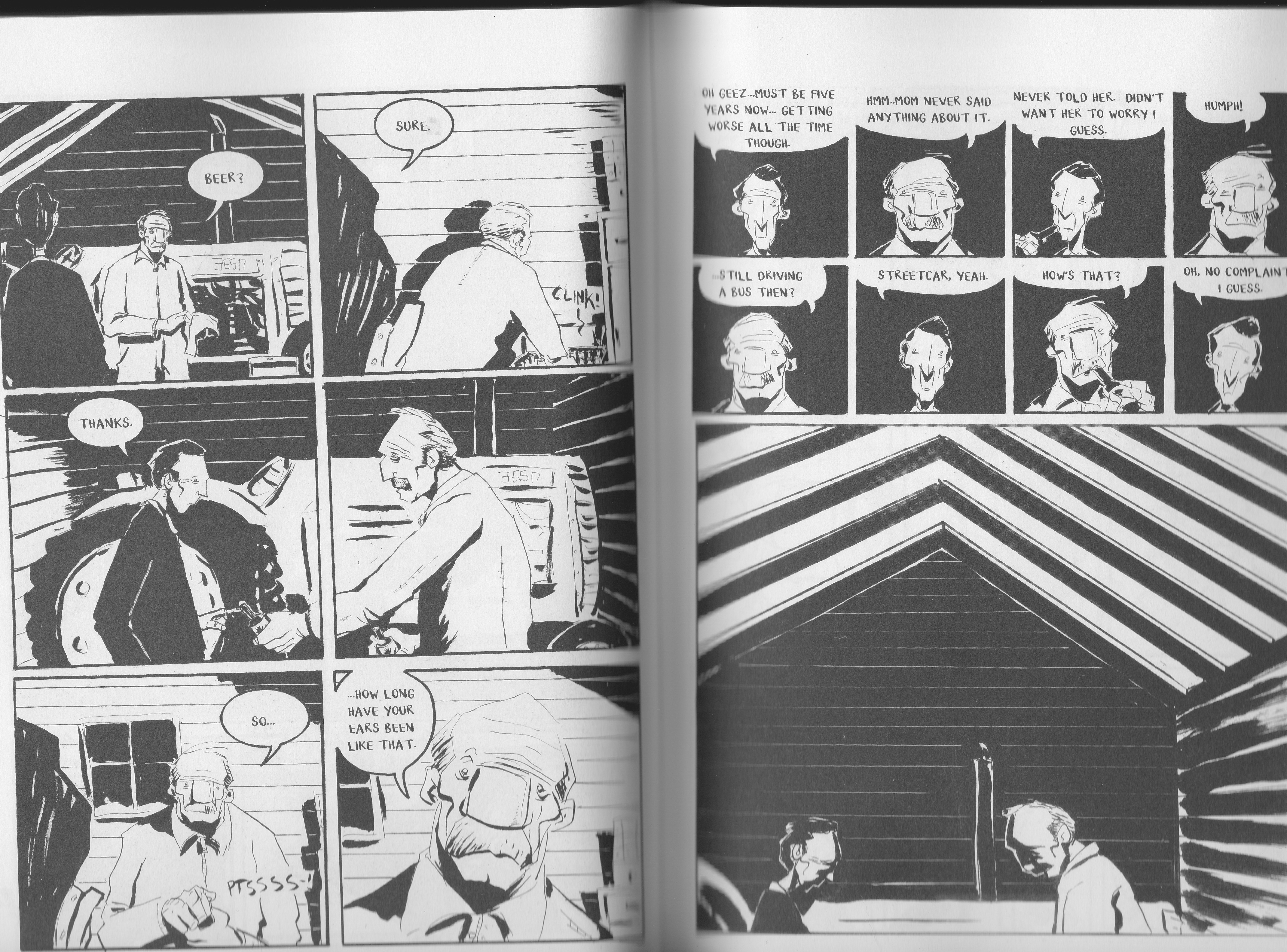 Unlike Vince’s posture, Lou’s more often aligns with open, empty space. Such is the case when he starts his job with the TTC and his image lines up with the November rain (223.1), the empty locker room as he changes into his uniform in middle age (237.2), the unbound streetcare when he driving it back to the farm in Essex County (245.3), and the light escaping the barn and house when he leaves the farm following his mother’s funeral (267.1). In each of these cases, Lou’s body repeatedly matches up with sparse lines along empty, depopulated space: this repetition not only associates him with loneliness, but it implies that Lou’s break from Vince results from his choosing to be alone, in contrast to Vince’s choice to be with others. Unlike Lou, Vince is able to cross lines and realign with broken paths, which is demonstrated after their mother’s funeral as Vince reaches across one panels to offer Lou a beer (258.3-4). Not only does the image portray Vince crossing the literal boundary between panels in the text, but Vince’s panel is on the right of Lou’s: that is, it is read after, miming a reach back in time through the graphic novel’s syntax. As Vince reaches backward through a solid break in the panels, Lou urges Vince to fight with him (263.1), illustrating that Lou cannot accept Vince’s forgiveness. Indeed, in refusing to apologize, Lou implies he does not even need to ask for it. Here Lou demonstrates another instance of his selfishness. Where Vince metaphorically reaches back through time through graphical syntax to come closer to his family, Lou chooses to isolate himself from Vince.